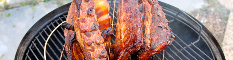 Around 11:00 AM I fired up the Weber Smokey Mountain Cooker with Kingsford briquets. For smoke flavoring I chose cherry wood which I purchased from Amazon.com, my new favorite retailer (I still love you, too, Costco, but Amazon Prime lets me get most everything with two-day shipping, and no sales tax). I put the ribs on around noon, and have been basting them every so often with the vinegar and pepper mix. These guys are gonna be good!